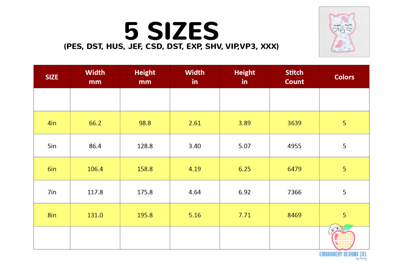The .ZIP file will contain the following formats: .PES, .CSD, .DST, .EXP, .HUS, .JEF, .SHV, .VIP, .XXX, .VP3, .PEC
