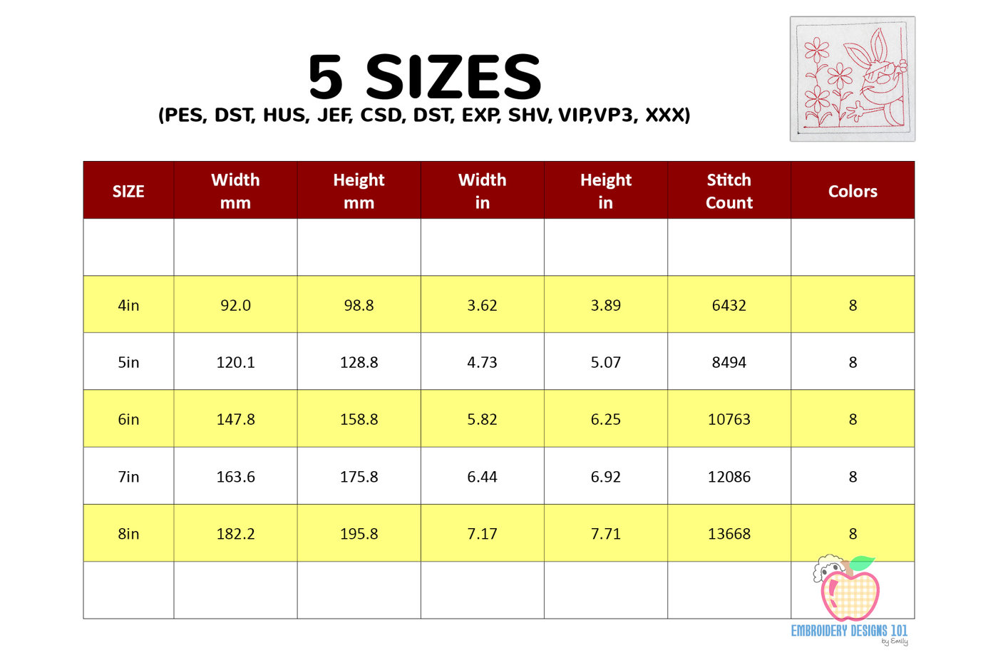 The .ZIP file will contain the following formats: .PES, .CSD, .DST, .EXP, .HUS, .JEF, .SHV, .VIP, .XXX, .VP3, .PEC