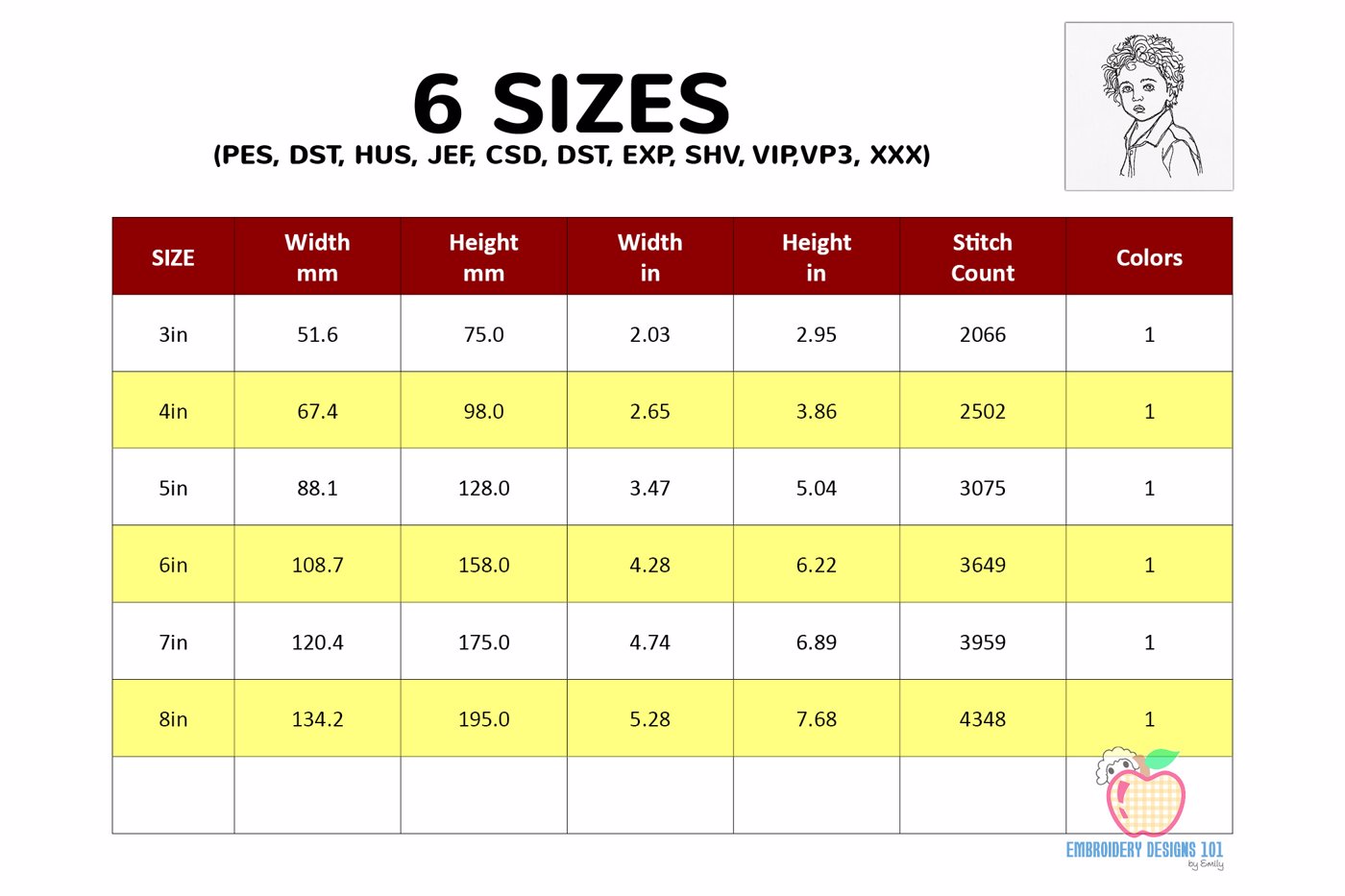 The .ZIP file will contain the following formats: .PES, .CSD, .DST, .EXP, .HUS, .JEF, .SHV, .VIP, .XXX, .VP3, .PEC