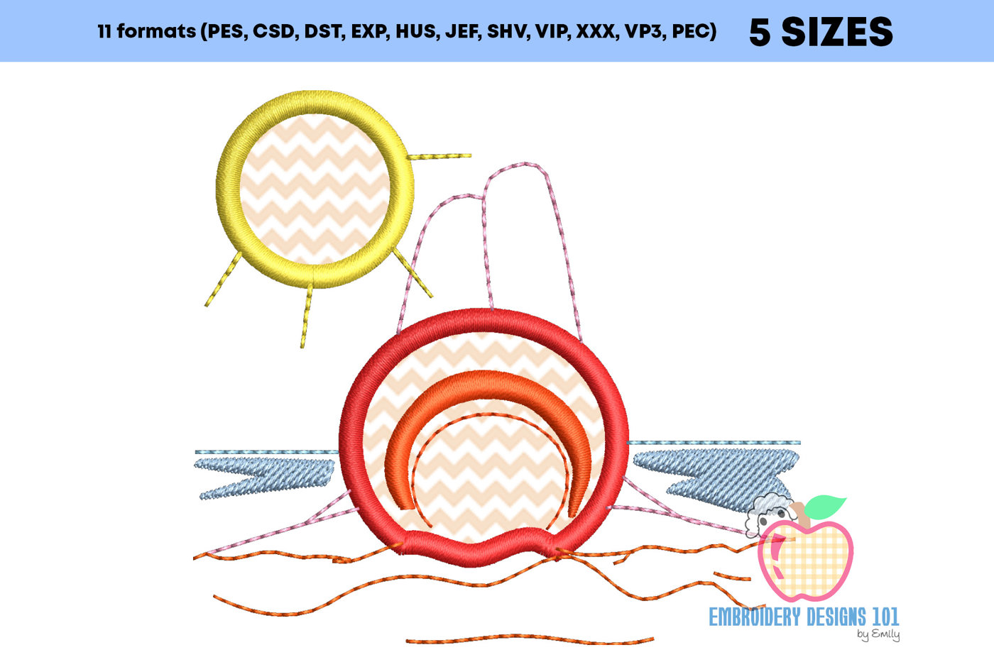 The .ZIP file will contain the following formats: .PES, .CSD, .DST, .EXP, .HUS, .JEF, .SHV, .VIP, .XXX, .VP3, .PEC