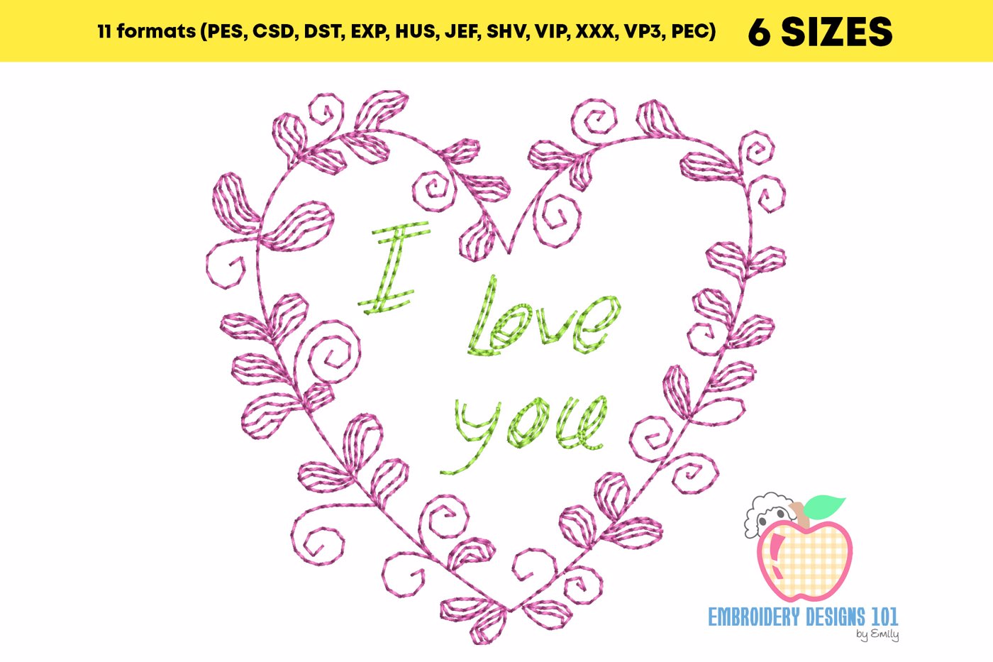 The .ZIP file will contain the following formats: .PES, .CSD, .DST, .EXP, .HUS, .JEF, .SHV, .VIP, .XXX, .VP3, .PEC