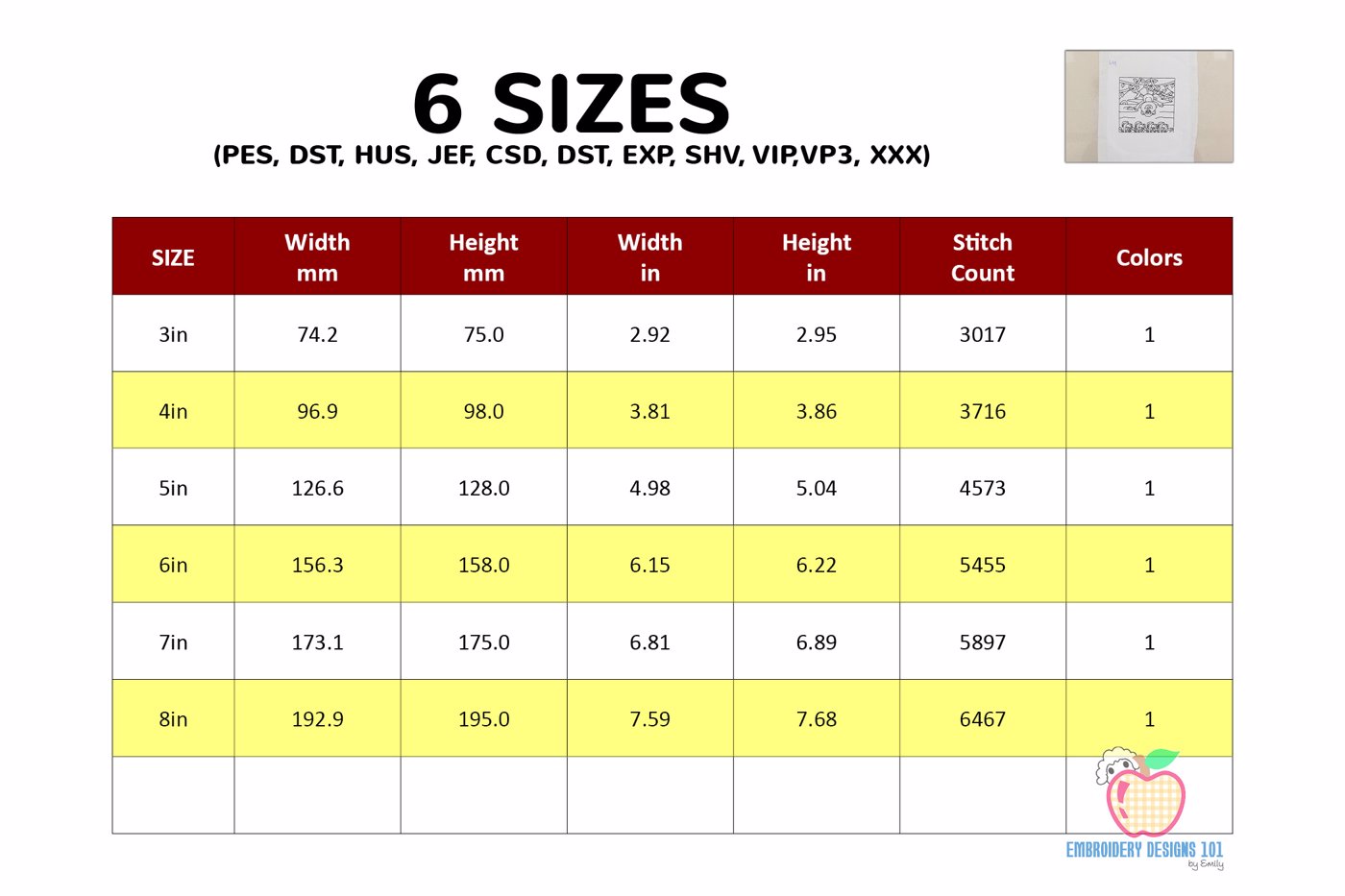 The .ZIP file will contain the following formats: .PES, .CSD, .DST, .EXP, .HUS, .JEF, .SHV, .VIP, .XXX, .VP3, .PEC