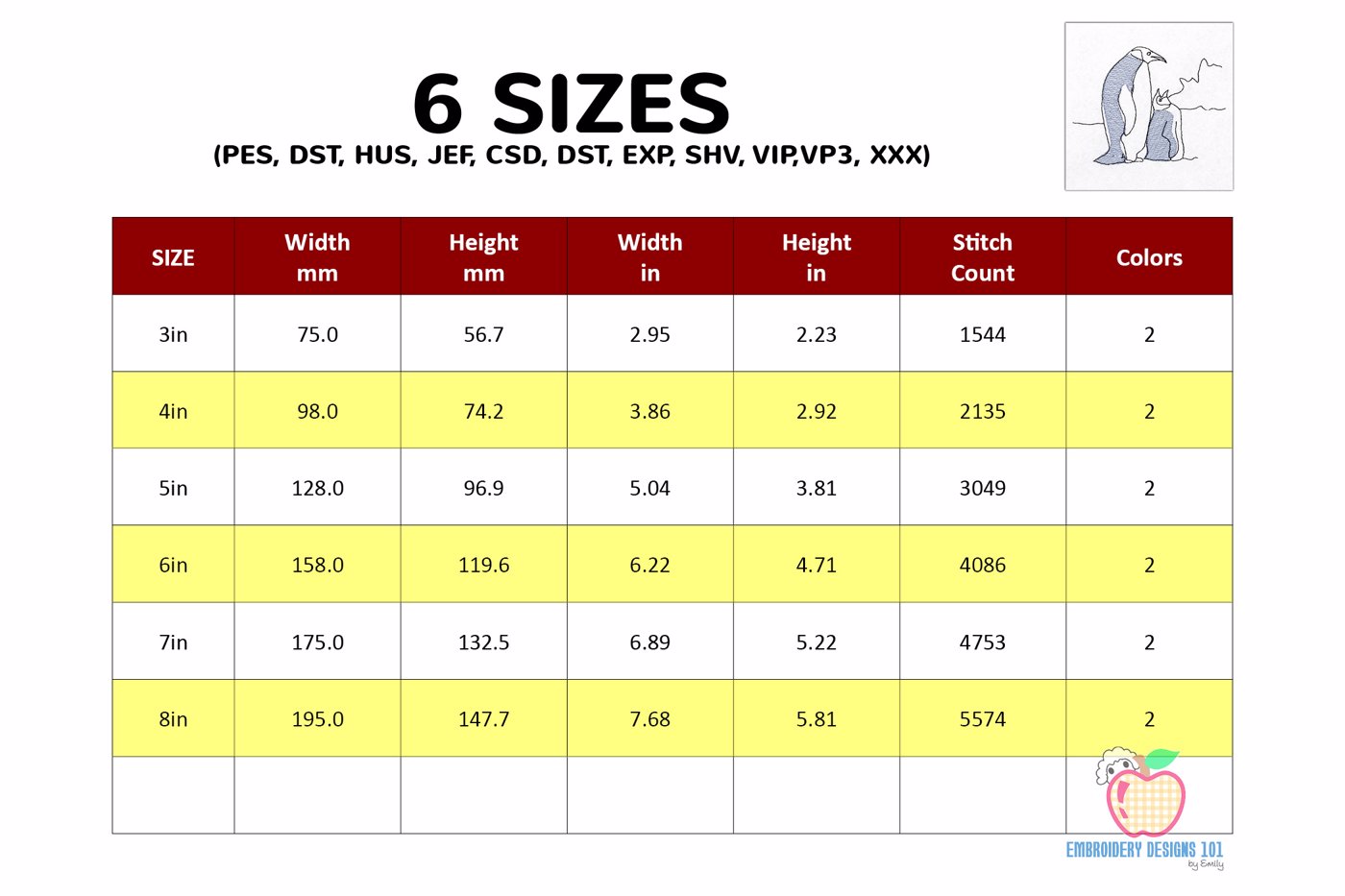 The .ZIP file will contain the following formats: .PES, .CSD, .DST, .EXP, .HUS, .JEF, .SHV, .VIP, .XXX, .VP3, .PEC