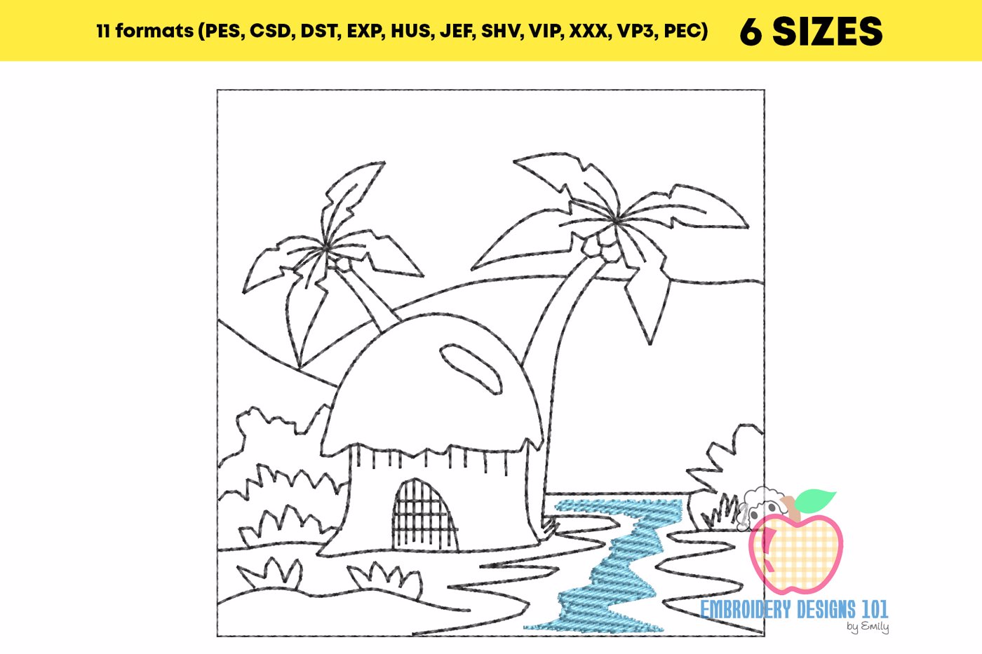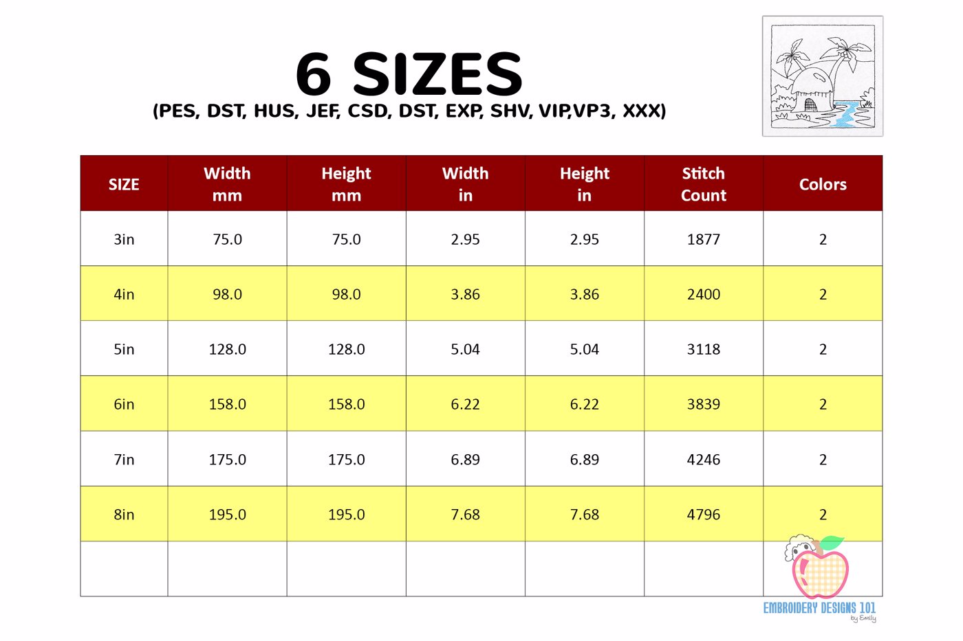 The .ZIP file will contain the following formats: .PES, .CSD, .DST, .EXP, .HUS, .JEF, .SHV, .VIP, .XXX, .VP3, .PEC