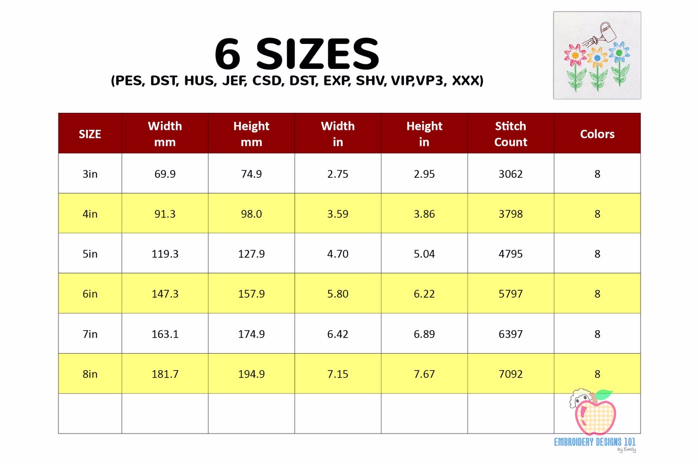 The .ZIP file will contain the following formats: .PES, .CSD, .DST, .EXP, .HUS, .JEF, .SHV, .VIP, .XXX, .VP3, .PEC