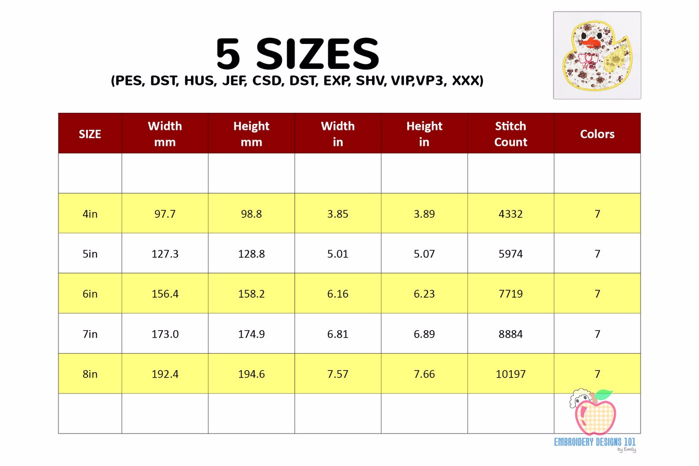 The .ZIP file will contain the following formats: .PES, .CSD, .DST, .EXP, .HUS, .JEF, .SHV, .VIP, .XXX, .VP3, .PEC