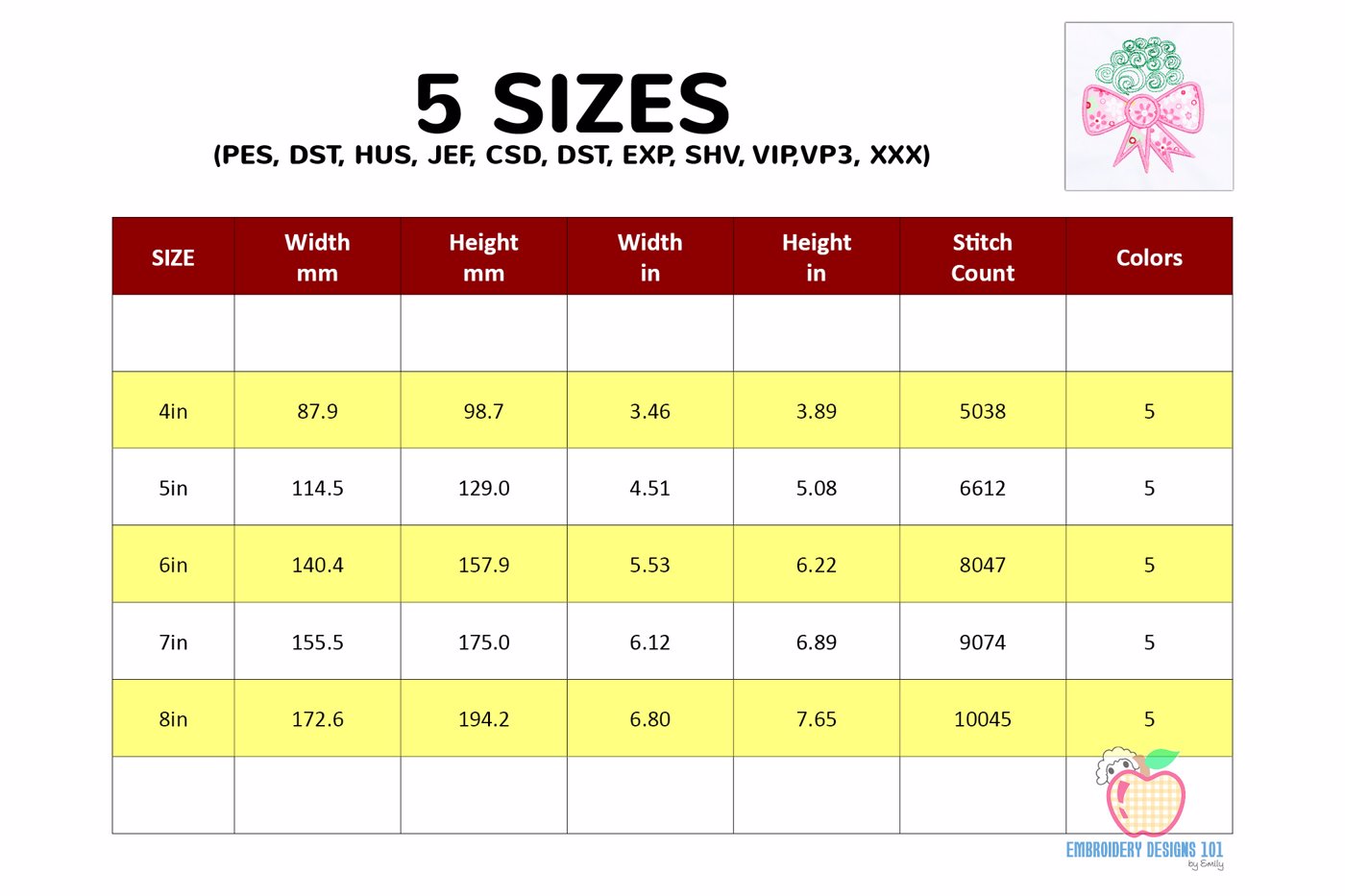 The .ZIP file will contain the following formats: .PES, .CSD, .DST, .EXP, .HUS, .JEF, .SHV, .VIP, .XXX, .VP3, .PEC