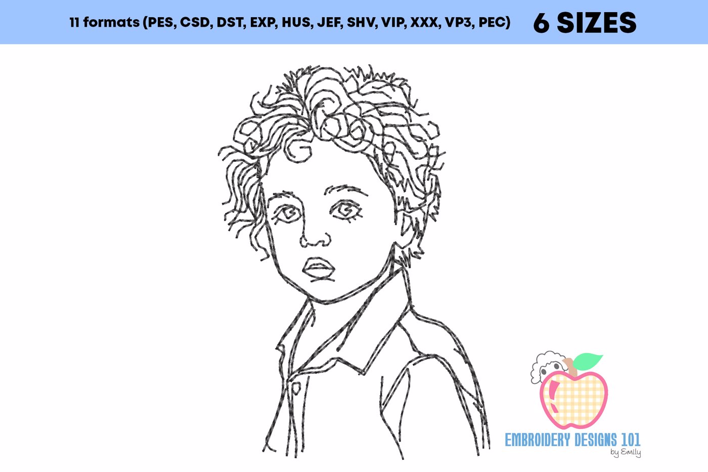 The .ZIP file will contain the following formats: .PES, .CSD, .DST, .EXP, .HUS, .JEF, .SHV, .VIP, .XXX, .VP3, .PEC