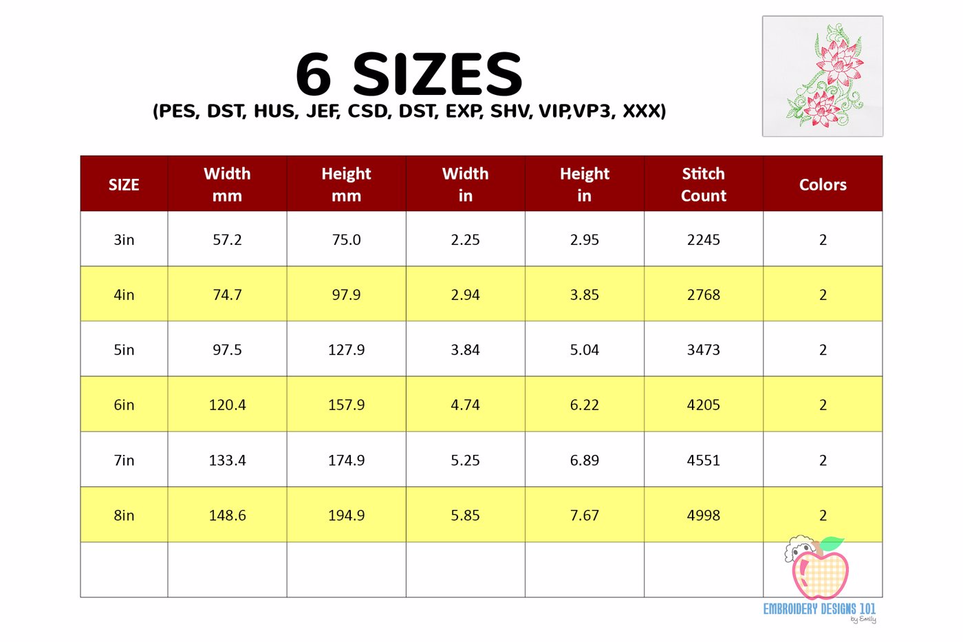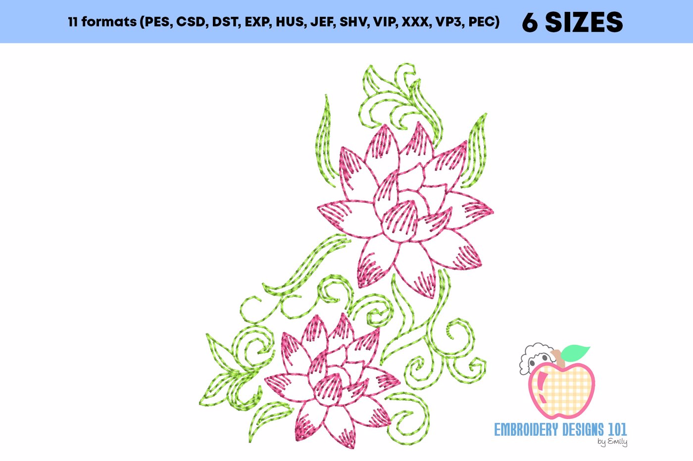 The .ZIP file will contain the following formats: .PES, .CSD, .DST, .EXP, .HUS, .JEF, .SHV, .VIP, .XXX, .VP3, .PEC